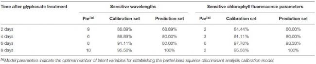 表1顯示了校準(zhǔn)和預(yù)測集獲得的識別精度。葉綠素?zé)晒庠诓莞熟⑻幚?天后,校準(zhǔn)組準(zhǔn)確值為97.78%,預(yù)測值為93.33%。高光譜的預(yù)測能力也是可接受的,校準(zhǔn)集準(zhǔn)確值為91.11%。建立在高光譜信息和葉綠素?zé)晒鈪?shù)上的檢測模型在施用草甘膦8天時獲得相同的識別結(jié)果。結(jié)果表明耐草甘膦的轉(zhuǎn)基因玉米可能是在草甘膦處理后6天鑒定。