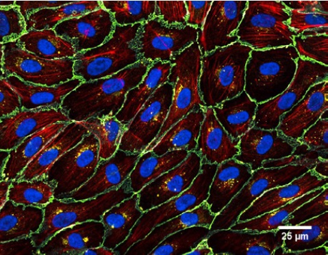 下圖實(shí)驗(yàn)顯示了靜態(tài)和流動(dòng)狀態(tài)下人臍靜脈內(nèi)皮細(xì)胞(HUVEC)的免疫熒光圖像,顯示在流體環(huán)境和靜止環(huán)境下細(xì)胞的不同狀態(tài)。 用鬼筆環(huán)肽(紅色)染色細(xì)胞骨架F-肌動(dòng)蛋白。 VE-鈣粘蛋白(綠色)標(biāo)記粘附連接點(diǎn)。 使用DAPI(藍(lán)色)染色細(xì)胞核。