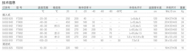JULABO投入式冷卻器根據(jù)工作溫度范圍以及冷卻頭尺寸的區(qū)別,一共擁有以下幾種型號(hào),其中FT402和FT902 具有數(shù)字化的溫度設(shè)定和顯示,能夠外接PT100溫度傳感器,可以準(zhǔn)確控制外部體系的溫度。