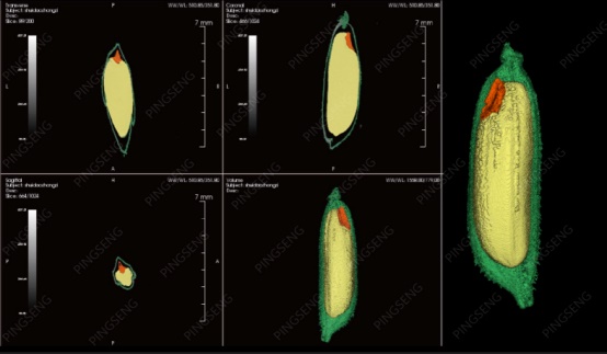 例2:以下是利用平生公司的NEMO® Micro CT對一粒水稻種子進行掃描成像,并利用平生自己開發(fā)的圖像分析軟件Avatar®進行分析處理。在圖像中可清晰觀察到種皮,胚乳、胚牙等內(nèi)部結(jié)構(gòu),并可給出這些組織的體積分析結(jié)果。