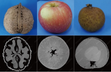 核桃、蘋果、龍眼的內(nèi)部結(jié)構(gòu)圖(上:實物;下:掃描重建圖)