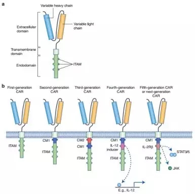 Figure 2.Structure of different chimeric antigen receptor (CAR) generations. a The core structure of a CAR, highlighting the major components of the extracellular domain, the transmembrane domain and the intracellular domain (endodomain). b Evolution of the development of CARs from the first generation, which contained only ITAM motifs in the intracellular domain. Second-generation CARs included one co-stimulatory molecule (CM)1,and third-generation CARs contained a second CM. The fourth generation of CARs was based on second-generation CARs (containing 1–3 ITAMs) paired with a constitutively or inducibly expressed chemokine (e.g. IL-12). These T cells are also referred to as T cell redirected for universal cytokine-mediated killing (TRUCKs). The fifth, or ‘next generation’, is also based on the second generation of CARs, with the addition of intracellular domains of cytokine receptors (e.g. IL-2Rβ chain fragment). ITAM immunoreceptor tyrosine-based activation motifs, CD co-stimulatory domain, IL-12 activation of interleukin 12 transcription, IL-2Rβ truncated intracellular interleukin 2β chain receptor with a STAT3/5 binding motif [3].