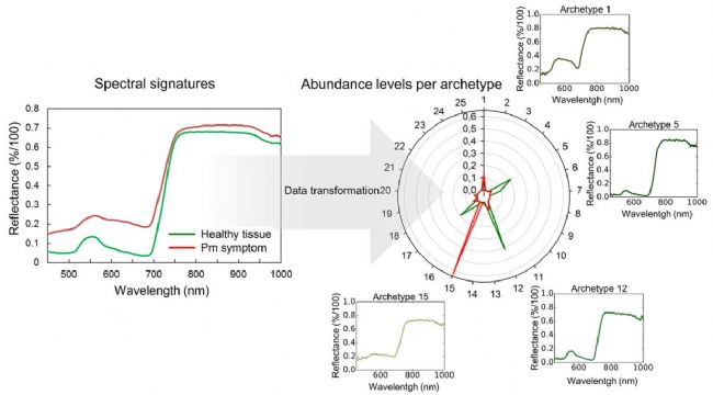 圖.2 健康植物組織和白粉病癥狀的光譜特征和豐度圖(平均值為50像素/每個)。光譜特征(左)表示傳感器的光譜測量區(qū)域上的像素的平均反射率。豐度圖(右)顯示了基于具有25個原型的相同像素豐度平均值的表現(xiàn),這些原型是在使用Simplex Volume Maximization轉換數據集期間選擇的。與健康或癥狀組織高度相關的原型單獨顯示,每個原型都是來自原始高光譜數據集的真實光譜特征(原型光譜特征的顏色代表相應像素的顏色,這對人眼來說是可見的),Pm代表白粉。╬owdery mildew)