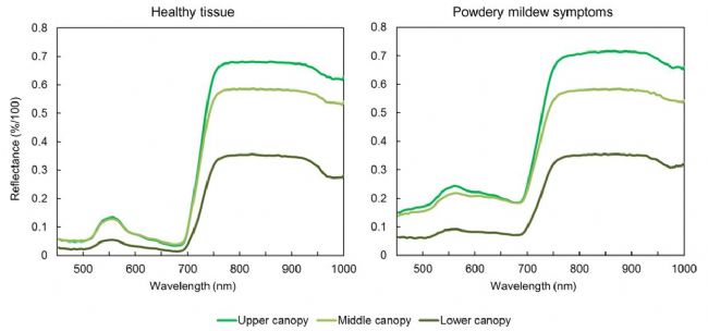 圖.3 不同冠層水平上對健康和有癥狀的組織所做的光譜特征圖譜(30個像素的平均值)