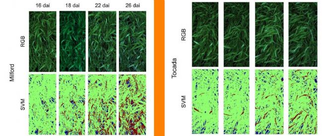 圖.5 實驗過程中(16天、18天、22天、26天)高易感品種Milford 和 Tocada(同樣時間段)在白粉病感染后的空間分布情況,通過pseudo RGB圖像和 Support Vector Machines (SVM)假彩色圖像分級(綠色為健康組織,紅色為白粉病癥狀,藍色為背景)