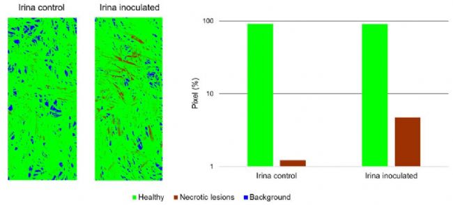 圖.6 大麥抗性品種Irina接種2天后健康組織和壞死病變組織對白粉病感染的分級情況,假彩色圖片顯示了Mini-plots中對照組和接種組植物的壞死病變空間分布。另外,圖像中總像素百分比被定義為過敏反應的組織以右側柱狀圖表示,接種組在被定義為壞死病變表達的像素占比上有明顯增加,
