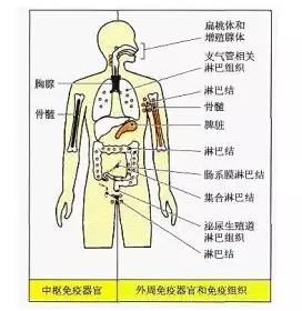 中樞免疫器官和組織是免疫細(xì)胞產(chǎn)生、分化、發(fā)育以及成熟的場(chǎng)所,包括骨髓和胸腺;外周免疫器官和組織是免疫細(xì)胞定居的場(chǎng)所,也是免疫細(xì)胞發(fā)揮免疫應(yīng)答效應(yīng)的場(chǎng)所,包括脾、淋巴結(jié)和黏膜相關(guān)淋巴組織。