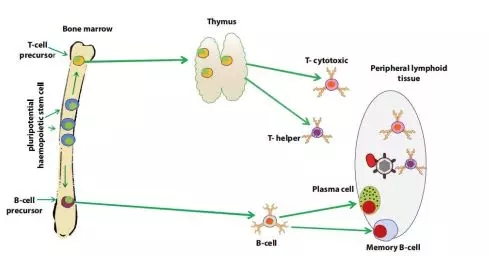 B細(xì)胞和T細(xì)胞的名字來(lái)源于它們發(fā)育的器官:B細(xì)胞在骨髓中發(fā)育;T細(xì)胞在胸腺中發(fā)育。