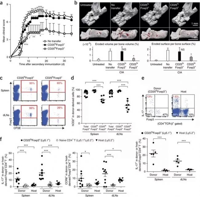 那么Foxp3的穩(wěn)定性對(duì)自身免疫關(guān)節(jié)炎有什么影響呢? Treg細(xì)胞的發(fā)展和功能受IL-2調(diào)控,F(xiàn)oxp3+T細(xì)胞由Foxp3+-穩(wěn)定CD25(IL-2Rα)hi和Foxp3+-不穩(wěn)定CD25lo細(xì)胞群組成。作者將CD25hiFoxp3+CD4+細(xì)胞和CD25loFoxp3+CD4+細(xì)胞(來(lái)源于未處理的DBA/1 Foxp3hCD2小鼠,hCD2作為標(biāo)簽指示Foxp3表達(dá)情況)轉(zhuǎn)移到膠原誘導(dǎo)型關(guān)節(jié)炎(collagen-induced arthritis ,CIA)疾病模型小鼠上,測(cè)定臨床評(píng)分及踝關(guān)節(jié)損傷情況,發(fā)現(xiàn)CD25hiFoxp3+CD4+細(xì)胞與對(duì)照組及CD25loFoxp3+CD4+細(xì)胞相比減輕了關(guān)節(jié)腫脹和損傷等癥狀(圖1a,b)。將細(xì)胞經(jīng)CFSE染料標(biāo)記后再轉(zhuǎn)移,結(jié)果顯示在脾臟和引流淋巴結(jié)(dLNs)中CD25loFoxp3+CD4+細(xì)胞丟失了部分Foxp3的表達(dá)(30-50%)(圖1c)。由此可見(jiàn), CD25loFoxp3+CD4+細(xì)胞因?yàn)閬G失了Foxp3而沒(méi)有辦法緩解發(fā)炎和骨損傷癥狀。思考到這里,我忍不住想問(wèn)了:丟掉Foxp3的CD25loFoxp3+CD4+細(xì)胞去哪了?