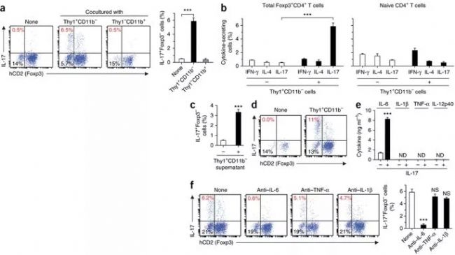 上述實(shí)驗(yàn)結(jié)果中可以發(fā)現(xiàn)ex Foxp3 TH17細(xì)胞在炎癥關(guān)節(jié)中聚集,作者假設(shè)關(guān)節(jié)中存在細(xì)胞與Foxp3+T細(xì)胞反應(yīng),促使其轉(zhuǎn)變?yōu)門H17細(xì)胞。設(shè)計(jì)實(shí)驗(yàn)從關(guān)節(jié)炎小鼠中分離Thy1+CD11b-細(xì)胞(滑膜成纖維細(xì)胞)和Thy1-CD11b+細(xì)胞(滑膜巨噬細(xì)胞)與Foxp3+CD4+T細(xì)胞(從未處理的Foxp3hCD2小鼠中分離)共同培養(yǎng),Thy1+CD11b-細(xì)胞下調(diào)了Foxp3+CD4+T細(xì)胞中Foxp3表達(dá)(圖3a)。將Thy1+CD11b-細(xì)胞與Foxp3+CD4+T細(xì)胞或naïve CD4+ T細(xì)胞共同培養(yǎng),檢測(cè)IL17+ Foxp3-細(xì)胞比例變化及細(xì)胞因子的表達(dá)(IFN-γ、IL-4),結(jié)果顯示滑膜成纖維細(xì)胞使exFoxp3 T細(xì)胞上調(diào)了IL-17的表達(dá)水平,IFN-γ和IL-4表達(dá)沒(méi)有變化,表明滑膜成纖維細(xì)胞在關(guān)節(jié)中促使Foxp3+T細(xì)胞轉(zhuǎn)變?yōu)門H17細(xì)胞。Naïve CD4+ T細(xì)胞沒(méi)有促使發(fā)生這一轉(zhuǎn)變。進(jìn)一步研究這一轉(zhuǎn)變發(fā)生的機(jī)制,將Thy1+CD11b-細(xì)胞和與Foxp3+CD4+T細(xì)胞共同培養(yǎng)的上清液與細(xì)胞分離分別檢測(cè)(圖3d),發(fā)現(xiàn)細(xì)胞并不能引起這個(gè)轉(zhuǎn)變;檢測(cè)和分析上清液的細(xì)胞因子表達(dá),結(jié)果顯示Thy+CD11b-細(xì)胞上清產(chǎn)生較高的IL-6因子,并在IL-17存在的情況下,IL-6表達(dá)進(jìn)一步加強(qiáng)(圖e)。加入抗IL-6抗體抑制了exFoxp3+ TH17細(xì)胞的產(chǎn)生。證明來(lái)源于滑膜成纖維細(xì)胞的IL-6是促使Foxp3+CD4+T細(xì)胞轉(zhuǎn)變?yōu)門H17細(xì)胞的關(guān)鍵因素。