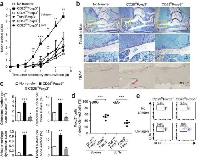 胸腺來(lái)源的穩(wěn)定的Foxp3+CD4+ T細(xì)胞與自身抗原有較高的親和力,維持了自身耐受性。作者假設(shè)不穩(wěn)定的Foxp3+CD4+T細(xì)胞也包含自我反應(yīng)T細(xì)胞,并且在失去Foxp3表達(dá)之后導(dǎo)致關(guān)節(jié)炎發(fā)生。為了研究自身抗原特異性的exFoxp3 T細(xì)胞的作用,作者將CD25loFoxp3+、 CD25hiFoxp3+、Foxp3-、效應(yīng)記憶CD44hiFoxp3-CD4+T細(xì)胞(來(lái)源于膠原免疫的DBA/1 Foxp3hCD2小鼠)標(biāo)記CFSE,轉(zhuǎn)移到免疫小鼠模型中, CD25loFoxp3+細(xì)胞加速了關(guān)節(jié)炎發(fā)生,加重了癥狀。關(guān)節(jié)炎條件下,自身反應(yīng)CD4+ T 細(xì)胞主要來(lái)源于CD25loFoxp3+CD4+ T細(xì)胞(圖5a-c)。相比,CD25hiFoxp3+細(xì)胞顯著抑制了破骨細(xì)胞的生成,幾乎一半的CD25loFoxp3+細(xì)胞失去了Foxp3表達(dá),幾乎全部CD25hiFoxp3+細(xì)胞仍表達(dá)Foxp3(圖5d)。體外二型膠原刺激后, CD25loFoxp3+細(xì)胞開(kāi)始增殖,表明其包含更多的自身反應(yīng)T細(xì)胞(圖5e)。