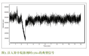 PerkinElmer提供的GC傳輸線, 可用于CLARUS或 AutoSystem ™ GC , 也可用于CLARUS 或AutoSystem™GC與NexION或ELAN®的ICP-MS平臺的聯(lián)用。 CLARUS GC系統(tǒng)對GC傳輸線的溫度進行控制, 以維持傳輸線中的分析物處于氣相, 并防止出現(xiàn)冷點[7]。 Ar氣流速由ICP-MS霧化器控制, 并在進入傳輸線前進行加熱。 足夠的流量對于待測物質(zhì)有效的傳送到等離子體中是很重要的。 通過三通(“T” 加入)氧氣, 而且氧氣同樣要通過傳輸線。 儀器設(shè)定完成后點炬, 測定15N+響應(yīng)值, 并根據(jù)15N+響應(yīng)值進行優(yōu)化。根據(jù)前期的工作, O2氣加入量和內(nèi)失活毛細管柱位置的優(yōu)化值(距離傳輸線中Silcosteel®管末端的相對位置) 分別為0.025 L/min 和 7 cm[7]。 通過在0.8-1.0 L/min 范圍內(nèi)改變Ar組成氣(O2流量為0.025 L/min)氣流量, 當觀察到5N+響應(yīng)值最大時, 確定最優(yōu)Ar組成氣氣流量。 在確定好最優(yōu)條件后, 注入有機溶劑(例如, 異辛烷, 己烷, 丙酮等) , 以確保待測物質(zhì)能夠進入等離子體。 圖3為注入異辛烷時5N+同位素信號典型的相應(yīng)圖。 5N+基線信號在2.5分鐘時的抑制正好與有機溶劑在等離子體中的燃燒相對應(yīng), 從而證明了GC氣體流滲透進入到等離子體中。 GC/ICP-MS系統(tǒng)的最優(yōu)條件列于表1。