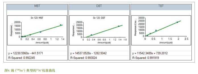 使用丁基錫標準溶液確定分析響應(yīng)特性。 Sn同位素(118, 119和120) 校正曲線的生成由重復三次注射1µL的標準溶液得到, 標準溶液的濃度范圍從0(即空白) 到2 ng/mL, 使用異辛烷溶液配制。由 120Sn響應(yīng)函數(shù)(圖4) 可見校準曲線具有良好的線性度和令人滿意的相關(guān)系數(shù)(R 2值) 。 檢出限(LOD=3σblank/m) 則由每個校準響應(yīng)函數(shù)得到,并且120Sn的MBT、 DBT 和 TBT的絕對檢出限分別為18, 200和7 fg。 DBT的絕對檢出限較高可能是因為空白紙較高, 而空白值高則與化學品制備過程中使用的容器和試劑所造成的污染有關(guān)。 這種現(xiàn)象很常見, 因為DBT被用于工業(yè)合成塑料。