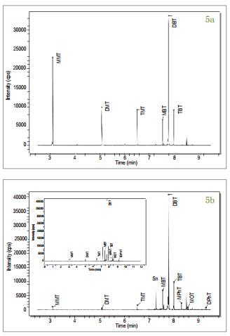 樣品制備, 微波萃取和衍生化均已有文獻資料記載[3-4]。甲基錫和丁基錫的儲備溶液(1000微克/毫升) 使用濃