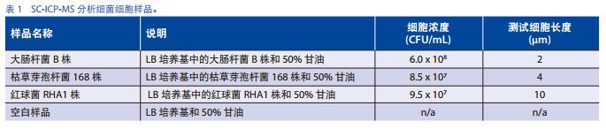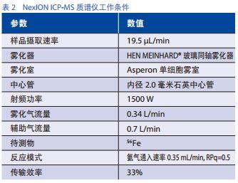 將細菌細胞樣品(表 1)放入 35℃水浴中解凍 1min,然后將樣品置于冰袋,使用 1% 磷酸鹽緩沖液 (PBS) 將樣品稀釋至含有 100,000 個細胞 /mL-1 的樣品稀釋液后立即上機 SC-ICP-MS分析。樣品在使用前應單獨解凍,以防止細菌隨著時間推移而降解。 SC-ICP-MS 以 dwell time50 µs(停留時間),每個樣品分析時間 1min,重復測定三次。測試將消耗 100 µL 樣品。通過采用 ICPMS 的純氨氣通入反應池的模式(反應模式),消除ArO+ 對 56Fe+ 的干擾。 SC-ICP-MS 工作條件見表 2。