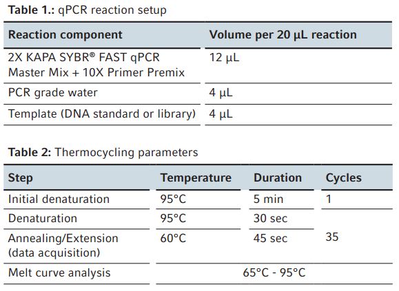 KAPA Library Quantifcation Kit contains all reagents required for quantifcation of NGS libraries for Illumina® sequencing, including KAPA SYBR® FAST qPCR Master Mix (2X), a Primer PreMix (10X) containing two primers based on Illumina P5 and P7 oligo sequences (Primer 1: 5’-AAT GAT ACG GCG ACC ACC GA-3’ and Primer 2: 5’-CAA GCA GAA GAC GGC ATA CGA-3’) and six ready-to-use DNA standards corresponding to a 10-fold dilution series. Standards consist of a linear, 452 bp dsDNA fragment flanked by qPCR primer binding sites. A KAPA Library Quantifcation Dilution Control, referred to asDNA Standard 0, is a 200 pM solution of the same linear, 452 bp dsDNA fragment. It is available for purchase separately and can be used to characterize impact of liquid handling on assay accuracy.
