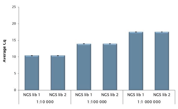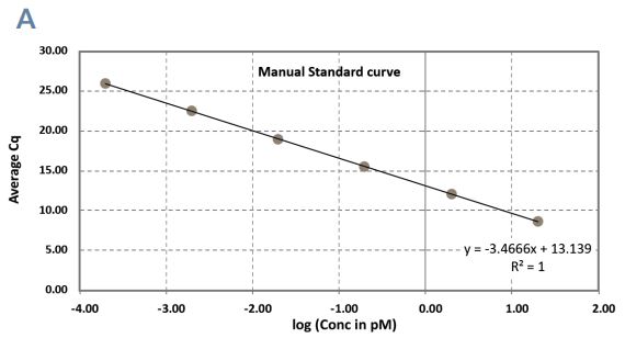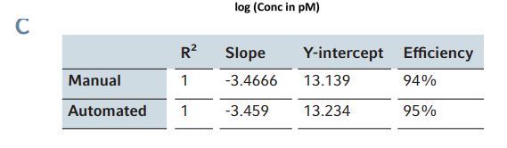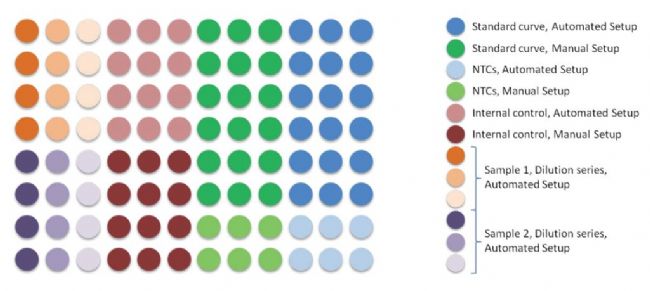 Manual and automated standard curves were generated using triplicate reactions for each standard. epMotion sample dilution accuracy was assessed using DNA Standard 0 diluted 1:10,000, as well as two NGS libraries diluted 1:10,000; 1:100,000; and 1:1,000,000. The same stock of reagents and samples were used in both manual and automated processes. The qPCR plate layout is illustrated on Figure 1.