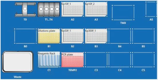 Before starting the program, the epMotion surfaces and tools were cleaned using a DNA decontamination solution “DNA Erase” and treated with UV-light for 15 minutes. The work table of epMotion 5075t instrument is equipped as in Figure 2.