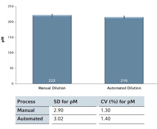 The reliability of qPCR results is highly related to the accuracy and precision of liquid handling in both reaction setup and library dilution. Accuracy and precision are two terms that are often used interchangeably, but are actually differentiated. Accuracy refers to how close a measurement is to a true value, while precision refers to how close repeat measurements are to each other and is thus a measure of reproducibility. This Application Note presents experimental results aimed at verifying the accuracy and precision of the KAPA Library Quantifcation Kit processed on the epMotion 5075t compared to manual handling.
