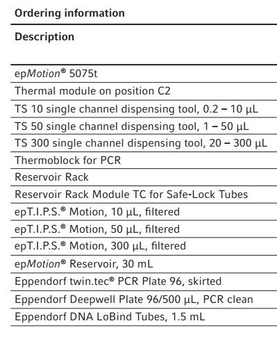 Performing an accurate qPCR assay manually in a high throughput setting becomes difcult and time consuming, and the use of an automated liquid handling platform is strongly recommended to reduce the risk of human error and increase the reliability of results. The Eppendorf epMotion® family of automated pipetting systems is an essential tool for many laboratories looking to achieve consistent results. The epMotion 5075t and other models in the Eppendorf family pipette volumes ranging from 0.2 µL to 1 mL with efciency and accuracy.