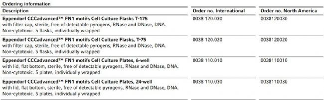 Based on a proprietary coating technology, the Eppendorf CCCadvanced FN1 motifs surface consists of synthetic fbronectin-derived motifs (including RGD), specifcally designed to mimic the cell attachment site of native extra cellular matrix (ECM) proteins. Used in combination with synthetic culture medium and dissociation solution, this surface represents an effective animal- and human-compo nent–free alternative to other biological coating-dependent culture systems.
