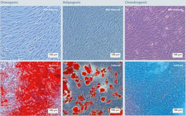 Figure 7: Multi-lineage differentiation potential of hMSC-BM after long-term expansion on the Eppendorf CCCadvanced FN1 motifs surface in an animal-component-free environment