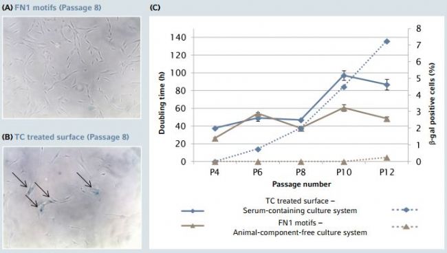 The altered cell morphology was indeed associated with a progressive increase of senescence-associated β-galactosidase positive cells as well as with a decreased proliferation potential during progressive hMSC expansion on a TC treated surface in the serum-containing culture system, especially after passage 8 (Figure 4). By contrast, hMSCs expanded in ACF culture conditions on the FN1 motifs surface maintained a stable doubling time across passages with no signifcant β-galactosidase activity.