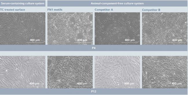 At an early passage following seeding (P4), cells displayed the expected hMSC-BM morphology corresponding to a fbroblast-like, spindle-shaped morphology on each tested synthetic surface. As previously described, cells expanded in a serum-containing culture system presented a wider spin dle-shape as compared to the more elongated cells expanded in serum-free conditions. On the FN1 motifs surface, this mor phology remained stable across passages. By contrast, cells expanded in the traditional culture system or on the competi tor A surface exhibited a higher proportion of very large cells at P12, suggesting the emergence of replicative senescence signs [14].