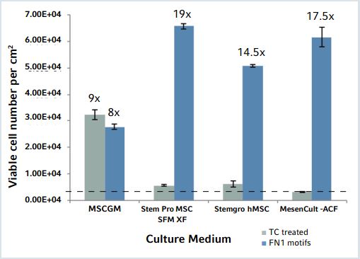 Seeded at comparable cell densities in different commercial serumfree media, the FN1 motifs surface efciently supports xeno-free hMSC expansion with high viable cell numbers 7 days post-seeding. Results are expressed in viable cell number per cm2 and represent a mean of three independent cell counts performed 7 days post-seeding. The dotted line indicates the initial cell seeding density (3,500 cells/ cm2). Average fold inductions are noted above columns.