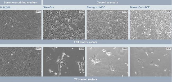 Figure 1: hMSC-BM morphology after short-term expansion on Eppendorf CCCadvanced FN1 motifs surface in different culture media