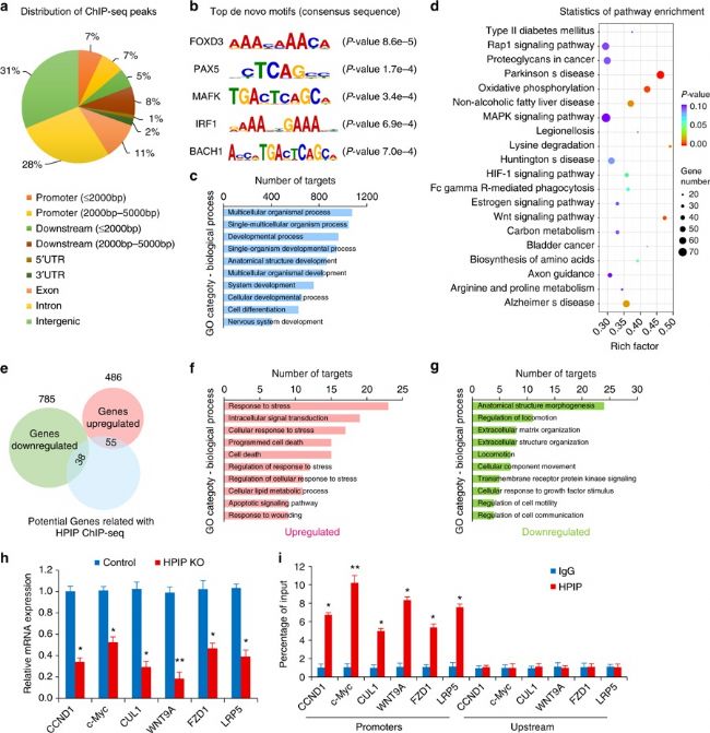之后,他們又利用全基因組染色質(zhì)免疫沉淀測序(ChIP-seq)來確定HPIP的直接靶點(diǎn)。結(jié)果顯示HPIP存在3136個明顯的ChIP-seq峰,包括PBX1。他們接著分析了ChIP-seq和RNA-seq數(shù)據(jù)的交集,發(fā)現(xiàn)有93個靶點(diǎn)受到HPIP缺失的直接調(diào)控。最終發(fā)現(xiàn),在HPIP缺陷型的軟骨細(xì)胞中,Wnt信號通路下游靶點(diǎn)的mRNA表達(dá)水平明顯下調(diào)。