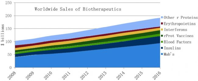 近年來,抗體被越來越多地應(yīng)用于疾病的治療,已占據(jù)生物藥品市場(chǎng)的40%以上,且還有不斷上升的趨勢(shì),而單克隆抗體又是生物制藥領(lǐng)域的熱門品種,目前其銷售額在生物藥銷售中占比已超過30%,可謂一枝獨(dú)秀。另據(jù)Evaluate統(tǒng)計(jì),到2020年過專利保護(hù)期的生物藥市場(chǎng)規(guī)模將達(dá)到約874億美金,極具市場(chǎng)吸引力,且其中不乏曾經(jīng)貢獻(xiàn)十幾到幾十億美金年銷售額的重磅藥物,它們就更加成為眾多生物制藥公司競(jìng)相仿制的重中之重。