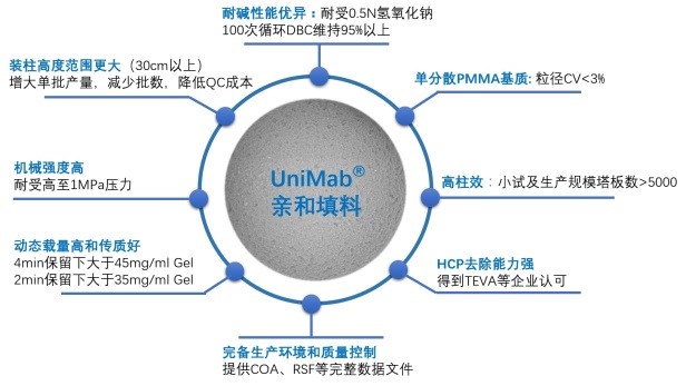 納微不僅是世界上為數(shù)不多能夠大規(guī)模生產(chǎn)單分散硅膠色譜填料的公司,而且還能夠大規(guī)模生產(chǎn)多樣化規(guī)格(包括多種粒徑孔徑等)單分散聚合物色譜填料,并且納微多年來始終堅(jiān)持創(chuàng)新突破,借助單分散聚合物微球作為基質(zhì),開發(fā)了多種可用于生物大分子分離純化的層析介質(zhì),其中單分散Protein A親和層析介質(zhì)UniMab®和NanoMab兩大系列就是極具代表性的填料產(chǎn)品:它們能夠很好地避免軟膠基質(zhì)親和介質(zhì)的不足之處,帶來更佳的分析分離表現(xiàn)。UniMab®使用時(shí)反壓低、化學(xué)穩(wěn)定性好、耐堿性強(qiáng);NanoMab是專為快速高效分析檢測(cè)單克隆抗體及含有Fc片段的重組蛋白類大分子而設(shè)計(jì)。由于該產(chǎn)品具有高度粒徑均一性,且孔穿透性好,機(jī)械強(qiáng)度高,因此具有動(dòng)態(tài)載量高,流速快,洗脫集中,流動(dòng)相消耗少等特點(diǎn),同時(shí)輔以極具創(chuàng)新性的“等保留時(shí)間放大”理論,可在實(shí)際研發(fā)生產(chǎn)中大幅度提高抗體生產(chǎn)效率,降低生產(chǎn)成本,畢竟對(duì)于昂貴的親和層析介質(zhì)只有采用基于領(lǐng)先性技術(shù)生產(chǎn)的單分散微球作為基質(zhì)才能更好地發(fā)揮出卓越的分析分離性能。