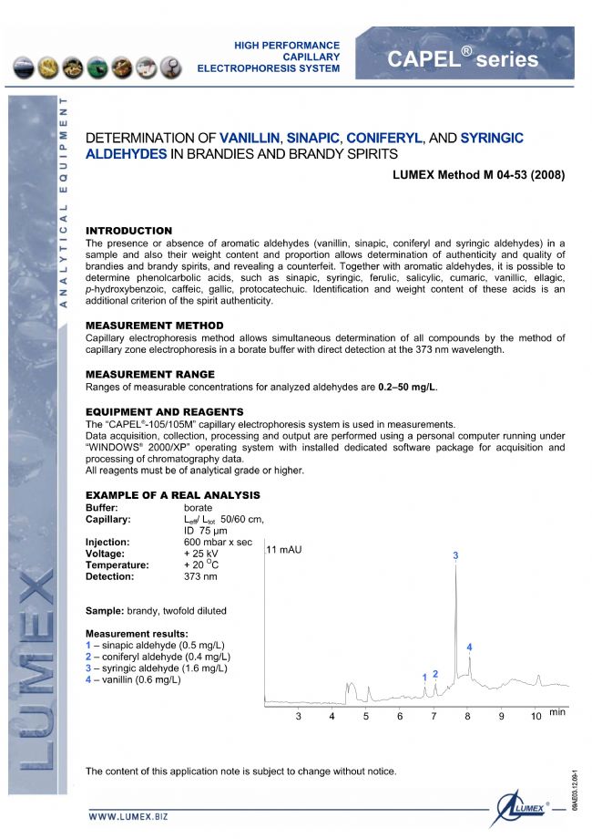 > 白蘭地中香草醛,介子,松柏醇和丁香醛的測定-LUMEX 毛細(xì)管電泳法