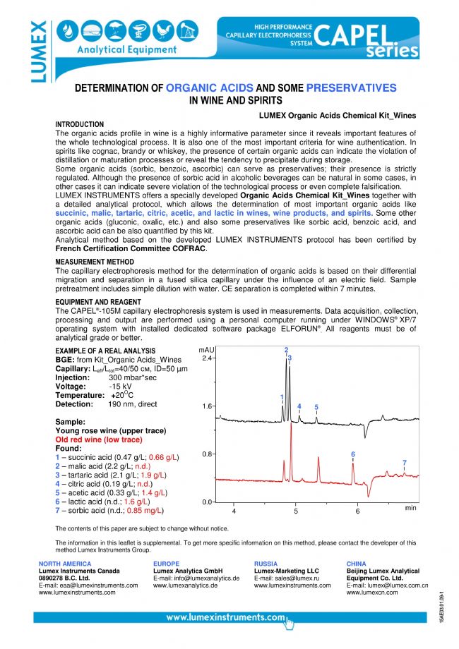 LUMEX儀器公司專門開發(fā)了一種有機酸分析包,它可以測定葡萄酒和烈酒中最重要的有機酸,如琥珀酸、蘋果酸、酒石酸、檸檬酸、乙酸和乳酸。另外一些其他的有機酸(葡萄糖酸、草酸等)和某些防腐劑(如山梨酸、苯甲酸和抗壞血酸)也可以用該試劑盒進行定量。基于LUMEX儀器開發(fā)的毛細管電泳分析葡萄酒的方法已得到法國認證委員會COFRAC的認證。