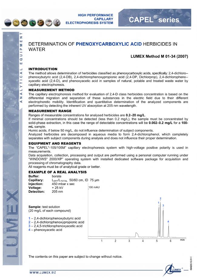 LUMEX毛細(xì)管電泳法可測(cè)定天然水、飲用水和廢水中的2,4-二氯-苯氧丁酸(2,4-DB),2,4-二氯苯氧丙酸(2,4-DP,二氯丙烷),2,4-二氯苯基-乙酸乙酯(2,4-D)和苯氧乙酸等除草劑。該法基于電場(chǎng)中不同物質(zhì)的遷移和分離的不同在205 nm波長(zhǎng)下檢測(cè)紫外吸收來進(jìn)行分析組分的鑒定和定量測(cè)定。