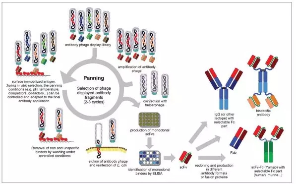 6. 將與靶點(diǎn)結(jié)合的噬菌體洗被脫下來,再感染宿主細(xì)胞,繁殖擴(kuò)增,進(jìn)行下一輪淘選;經(jīng)抗體片段在大腸桿菌中的可溶性表達(dá)與免疫分析(包括ELISA或流式細(xì)胞術(shù))就可以得到想要的高親和性抗體。[8,10]