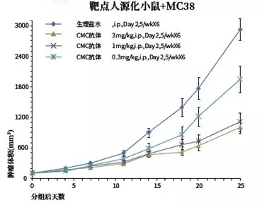 當(dāng)然,還有一種行之有效的辦法可以替代這些體外活性測試,那就直接利用建立腫瘤模型的免疫檢查點(diǎn)人源化小鼠在最初階段對抗體進(jìn)行篩選,獲得體內(nèi)藥效最好的分子!如圖6所示,將CMC階段G抗體進(jìn)行不同劑量的體內(nèi)藥效測試(靶點(diǎn)小鼠+MC38腸癌細(xì)胞系),依然具有較好的治療應(yīng)答。如此,便能通過體內(nèi)藥效拿到一款優(yōu)秀的人源抗體候選藥物,溜得飛起有木有?!