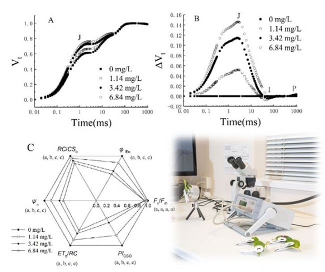 近期山東農(nóng)大園藝學(xué)院李清明教授團(tuán)隊(duì)成員鐘昕和山東農(nóng)大生科院高輝遠(yuǎn)教授團(tuán)隊(duì)合作,利用英國Hansatech公司制造的M-PEA多功能植物效率分析儀,與Oxytherm氧電極,研究了不同含量氧苯酮懸浮液對(duì)黃瓜葉片光合、呼吸、葉綠素?zé)晒獾挠绊懀约皩?duì)葉綠體光合電子傳遞、線粒體呼吸電子傳遞的瞬時(shí)抑制作用。