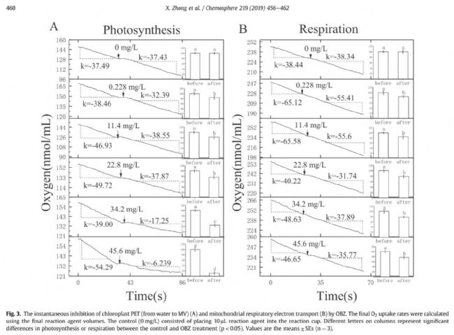 該研究首次揭示了氧苯酮對(duì)高等植物的光合作用和呼吸作用有顯著的抑制作用。而且極低含量的氧苯酮(0.228mg/L)就能對(duì)葉綠體和線粒體的電子傳遞產(chǎn)生即時(shí)的抑制作用。這暗示著氧苯酮對(duì)所有生物(具有呼吸作用)都有危害作用。