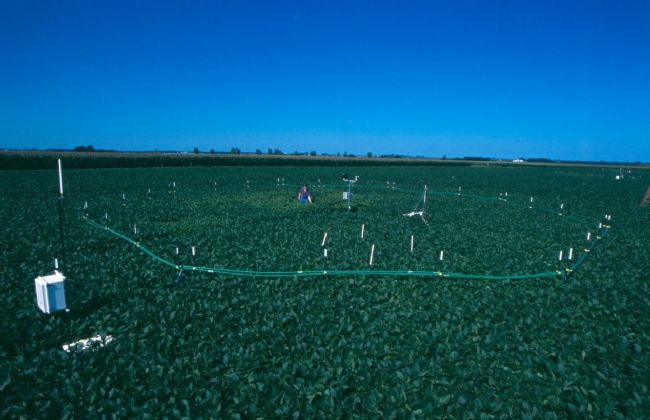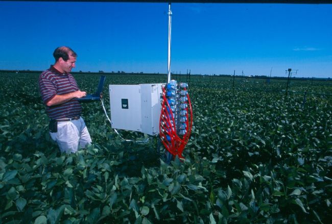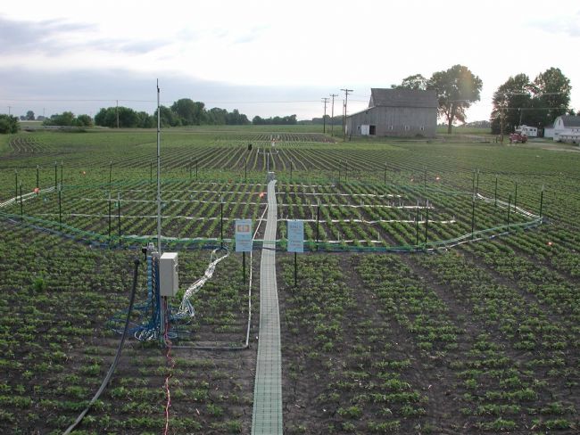 來自美國(guó)農(nóng)業(yè)部農(nóng)業(yè)研究局(USDA-ARS)和伊利諾伊大學(xué)厄巴納-香檳分校創(chuàng)造了SoyFACE(Soybean Free Air Concentration Enrichment)技術(shù),用于研究在實(shí)際野外生產(chǎn)條件下濃度增高的CO2和臭氧、高溫以及土壤水分變化對(duì)作物的影響。