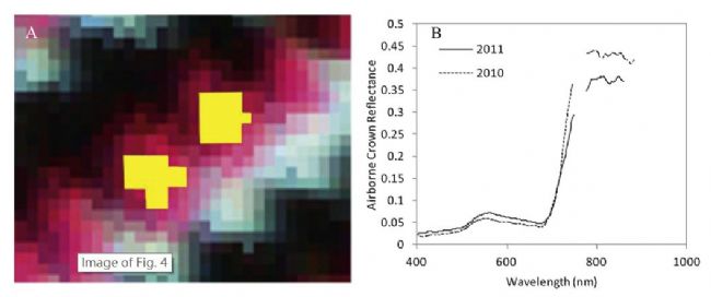 上圖A為冠層尺度目標(biāo)樹種高光譜成像,B為樹冠反射光譜,在2011和2010年表現(xiàn)出明顯的不同
