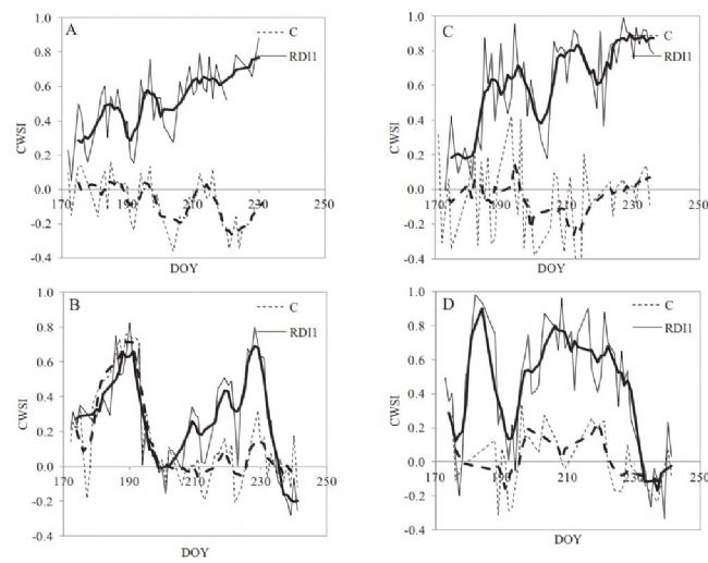 上圖為作物水分脅迫指數(shù)Crop Water Stress Index (CWSI)變化情況,A和B為普通樹種,C和D為桔子樹