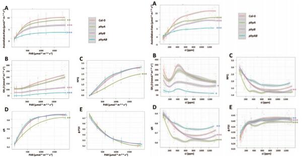 植物面對各種生物和非生物脅迫時,會調(diào)整它們的響應(yīng)機制來優(yōu)化發(fā)育和適應(yīng)程序。UV輻射作為一種環(huán)境因子,會影響植物的光合過程并觸發(fā)細胞死亡。華沙生命科學(xué)大學(xué)的Anna Rusaczonek評估了紅/遠紅光感受器光敏色素A和光敏色素B在擬南芥UV脅迫響應(yīng)中的作用。通過測量相關(guān)突變株的CO2同化、葉綠素?zé)晒猓ò晒獯銣鐒恿W(xué)曲線和OJIP快速熒光動力學(xué)曲線)、活性氧積累等,他發(fā)現(xiàn)UV脅迫干擾了光系統(tǒng)II,并增加了相關(guān)突變體的死亡率。