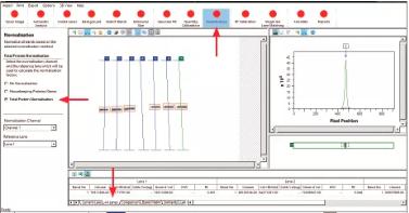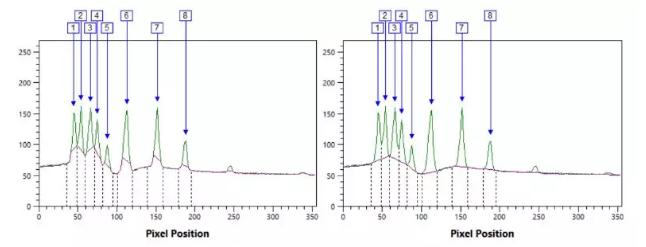 AzureSpot執(zhí)行歸一化。 紫色線始終是背景,綠色線之上將是信號。 首先選擇一條泳道作為參考泳道(或標準化標準)。 對于每個泳道,計算歸一化因子即泳道中所有條帶的灰度值除以參考泳道中的所有條帶的灰度值。 接下來計算所有通道中的歸一化值,即條帶的原始灰度值除以歸一化因子。