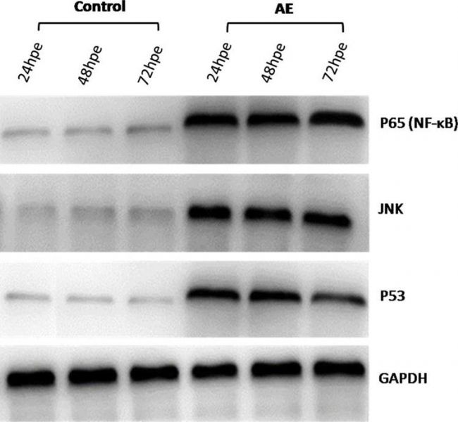 引用抗體:P65(ET1603-12)、P53(ET1601-13)、JNK(ET1601-28)、GAPDH (M1310-2)