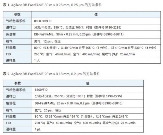 使用配備火焰離子化檢測器 (FID) 的 8860 氣相色譜儀分析 FAME。使用配備 5 μL 進(jìn)樣針和分流/不分流進(jìn)樣口的 Agilent7693A 自動液體進(jìn)樣器進(jìn)樣。表 1 和表 2 列出了儀器和條件。