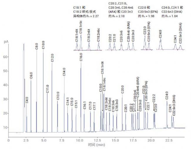 圖 1 為 30 m DB-FastFAME 色譜柱上獲得的 37 組分 FAME 混標(biāo)的典型色譜圖。在某些應(yīng)用中,順式和反式 C18:1、順式和反式 C18:2、C22:0、C20:3、C22:6、C24:1 可能發(fā)生共流出,導(dǎo)致峰歸屬出現(xiàn)問題。如圖 1 所示,8860 氣相色譜系統(tǒng)使用表中條件,37 種化合物都得到了完全分離,峰形尖銳對稱且運行時間縮短至 24 分鐘以內(nèi)。特別值得注意的是分離順-反異構(gòu)體以及 EPA 和 DHA 組分的能力。該方法對于復(fù)雜混合物中脂肪酸的定量分析非常有用,特別是測定魚油等基質(zhì)中的 EPA 和 DHA。與 0.18 mm 內(nèi)徑色譜柱相比,這種 30 m × 0.25 mm, 0.25 μm 色譜柱內(nèi)徑較大、膜厚較厚,具有更大的色譜柱容量和更長的色譜柱壽命。