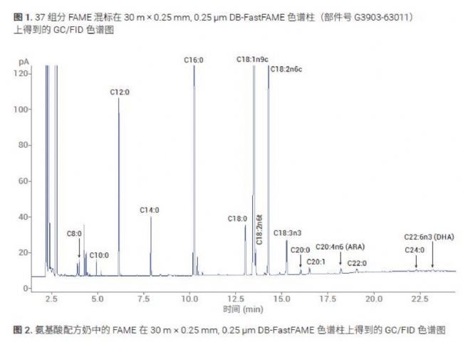 本應(yīng)用簡報介紹了采用兩種長度的 DB-FastFAME 色譜柱、以氮氣為載體的 8860 氣相色譜系統(tǒng)方法,該方法相對較快。測定了峰面積的 RSD,并對 ARA、EPA、DHA 等關(guān)鍵的中性脂肪進(jìn)行了定量分析。為證明該方法的適用性,本應(yīng)用還對嬰兒配方奶樣品進(jìn)行了分析。