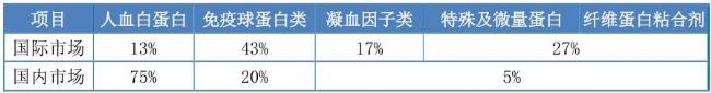表1 國(guó)際與國(guó)內(nèi)市場(chǎng)五類血液制品市場(chǎng)占有率